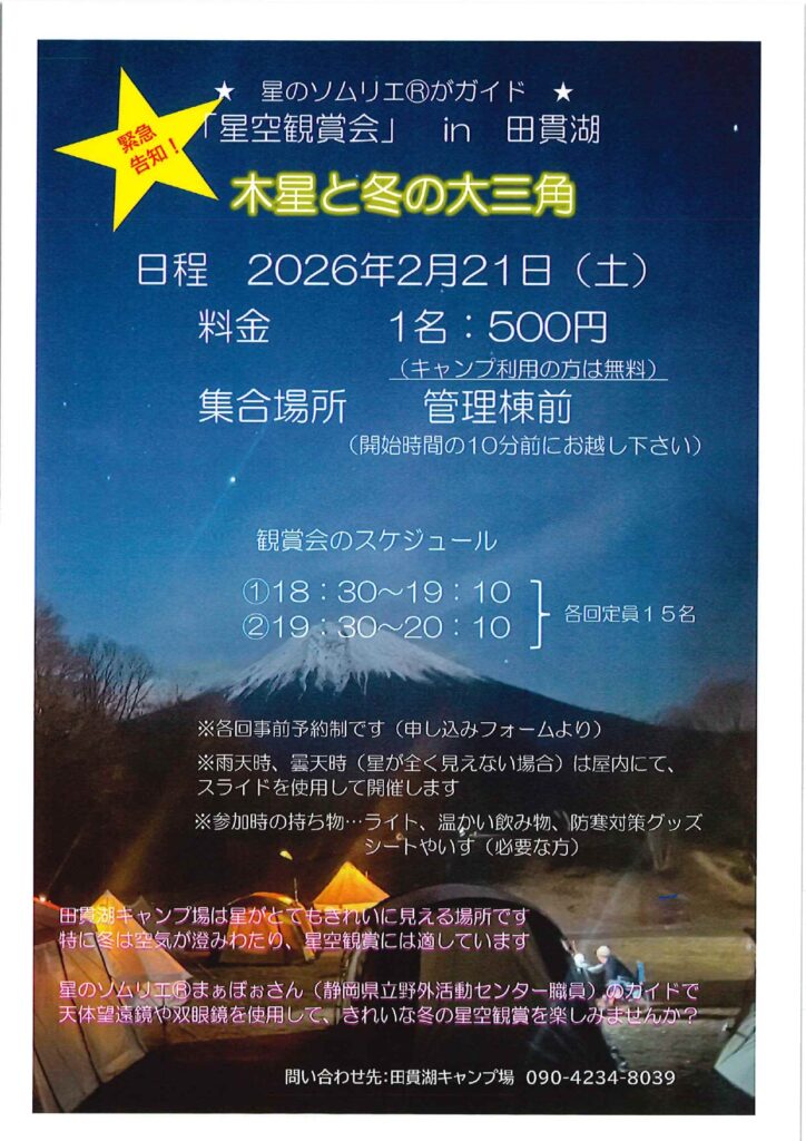令和8年2月21日(土)に星のソムリエⓇまぁぼぉさん(静岡県立野外活動センター職員)を招いて木星と冬の大三角をみんなで眺めよう!というイベントを開催することが決定しました。