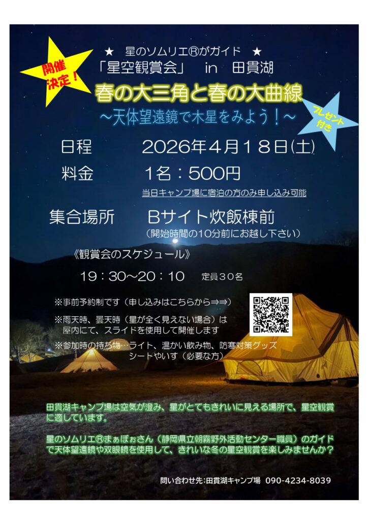 令和8年4月18日(土)に星のソムリエⓇまぁぼぉさん(静岡県立朝霧野外活動センター職員)を招いて春の星空観賞会を開催することが決定しました。